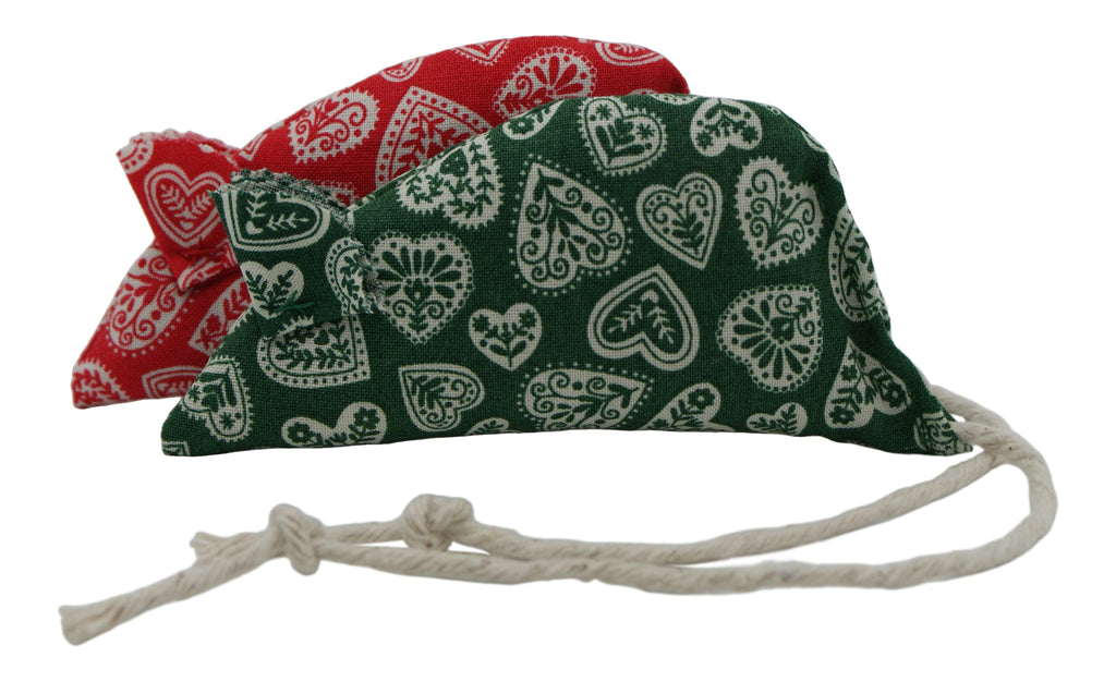 One of each of our traditional Scandi Hearts on red fabric and Scandi Hearts on green fabric catnip mice,